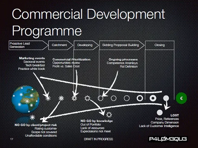 Acompañamiento en cualquiera de las fases de venta, desde la concepción del deal en fase de presupuestos, configuración del equipo de venta y propuesta ideal, colaboración en el desarrollo del “proyecto de venta” y especialmente maximizando las posibilidades de éxito.